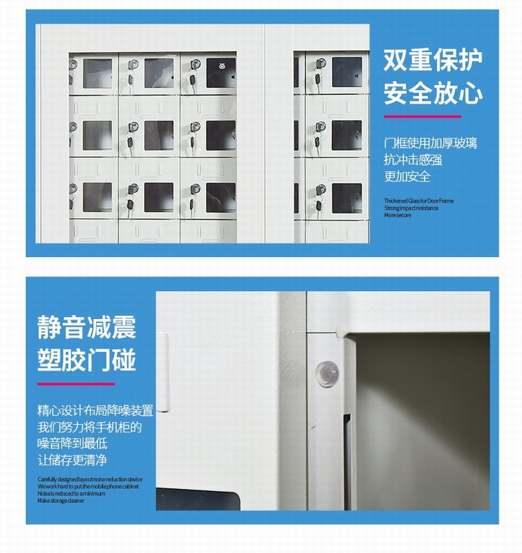 手機保密柜正面為對開金屬邊框玻璃大門,便于觀察柜內情況,堅固透亮,美觀大方。